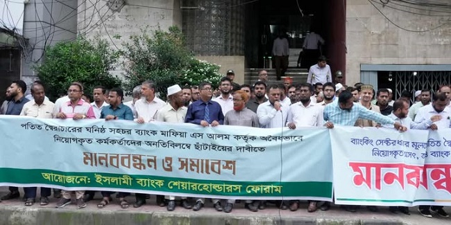 ব্যাংক খাতের অর্থ লুটকারী এস আলম কর্তৃক অবৈধভাবে নিয়োগকৃত অদক্ষ কর্মকর্তা কর্মচারিদের ইসলামী ব্যাংক থেকে অপসারনের দাবীতে ইসলামী ব্যাংক শেয়ারহোল্ডারস ফোরাম আজ ৬ অক্টোবর ২০২৫ সোমবার রাজধানীর দিলকুশায় ইসলামী ব্যাংক টাওয়ারের সামনে মানববন্ধন ও সমাবেশ করে। একই সাথে সারাদেশে ইসলামী ব্যংকের প্রতিটি শাখার সামনে ইসলামী ব্যাংক গ্রাহক ফোরাম অবিলম্বে ইসলামী ব্যংক থেকে এস আলমের মাধ্যমে অবৈধ নিয়োগপ্রাপ্ত কর্মকর্তা কর্মচারিদের বরখাস্ত করার দাবীতে মানববন্ধন ও বিক্ষোভ সমাবেশ করে। সমাবেশে বক্তারা দ্রুততম সময়ের মধ্যে ইসলামী ব্যাংক থেকে অবৈধ নিয়োগপ্রাপ্তদের অপসারণের আহ্বান জানান। আগামী বৃহস্পতিবারের মধ্যে অবৈধ এসব কর্মকর্তাদের অপসারণ করা না হলে শেয়ারহোল্ডার ও গ্রাহকরা বৃহত্তর আন্দোলন শুরু করবে বলে জানিয়েছেন।