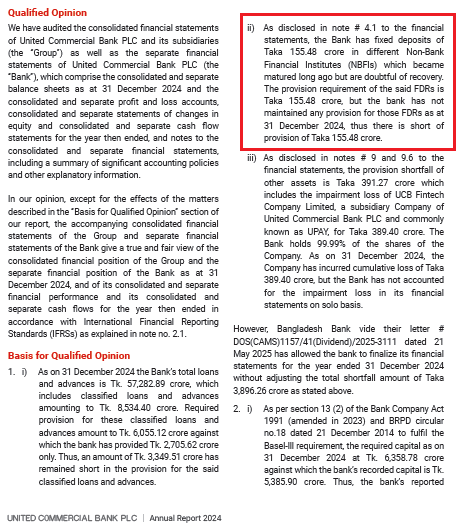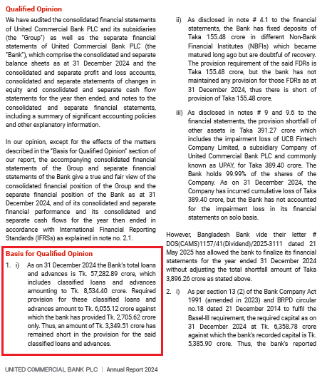 ২০২৪ সালের অডিট রিপোর্ট অনুযায়ী, ৩১ ডিসেম্বর ২০২৪ তারিখ পর্যন্ত ইউসিবির মোট প্রভিশন ঘাটতি দাঁড়িয়েছে ৩,৮৯৬.২৬ কোটি টাকা। বাংলাদেশ ব্যাংকের পত্র (নং DBI-4/7007/2025-635, তারিখ ২৭ এপ্রিল ২০২৫) অনুযায়ী, ব্যাংকটির বিভিন্ন খাতে প্রভিশন স্বল্পতার মোট অঙ্ক ৩,৯৯২.৩০ কোটি টাকা ছিল। পরে ব্যাংক কিছু সামান্য সমন্বয় করে ৩,৮৯৬.২৬ কোটি টাকায় নামায়। এরমধ্যে ৩,৩৪৯.৫১ কোটি টাকা ঋণ খাতে, ১৫৫.৪৮ কোটি টাকা এনবিএফআই ডিপোজিটে, এবং ৩৯১.২৭ কোটি টাকা অন্যান্য সম্পদে ঘাটতি।