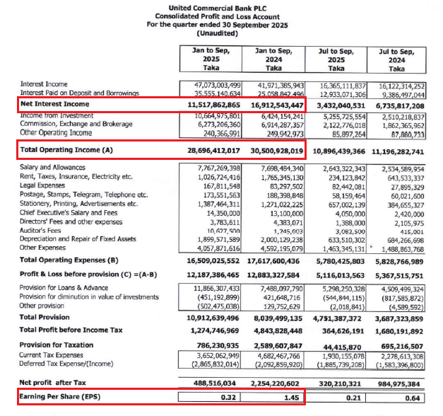 ব্যাংকটির ৯ মাসের প্রতিবেদনের তথ্য অনুযায়ী, ২০২৫ সালের প্রথম ৯ মাসে ব্যাংকটির নিট ইন্টারেস্ট ইনকাম ১,১৫১ কোটি ৭৮ লাখ ৬২ হাজার ৮৬৫ টাকা হয়েছে। অথচ ২০২৪ সালের একই সময়ে ব্যাংকটির নিট ইন্টারেস্ট ইনকামের পরিমাণ ছিলো ১,৬৯১ কোটি ২৫ লাখ ৪৩ হাজার ৪৪৭ টাকা। অর্থ্যাৎ আলোচ্য সময়ে ইন্টারেস্ট ইনকাম কমেছে ৫৩৯ কোটি ৪৬ লাখ ৮০ হাজার ৫৮২ টাকা বা প্রায় ৩২ শতাংশ।