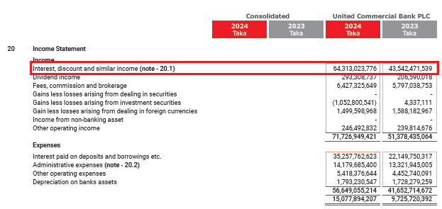 আর্থিক প্রতিবেদনের ২০ নম্বর নোটে বলা হয়েছে, ২০২৪ সালে ব্যাংকের সুদ আয় ৬,৪৩১ কোটি ৩০ লাখ ২৩ হাজার ৭৭৬ টাকা, আগের বছর যার পরিমাণ ছিলো ৪,৩৫৪ কোটি ২৪ লাখ ৭১ হাজার ৫৩৯ টাকা। সে হিসেবে এক বছরে সুদ আয় ২,০৭৭ কোটি টাকা বাড়লেও ইন্টারেস্ট সাসপেন্স নতুন করে বেড়েছে ৫০ শতাংশের বেশি। অর্থ্যাৎ সুদ আয়ের একটি বড় অংশ কার্যত স্থগিত বা অপ্রাপ্ত। অর্থ্যাৎ ব্যাংক যে সুদকে আয় হিসেবে ধরে রেখেছে, তার বাস্তব নগদ প্রবাহ আসেনি।