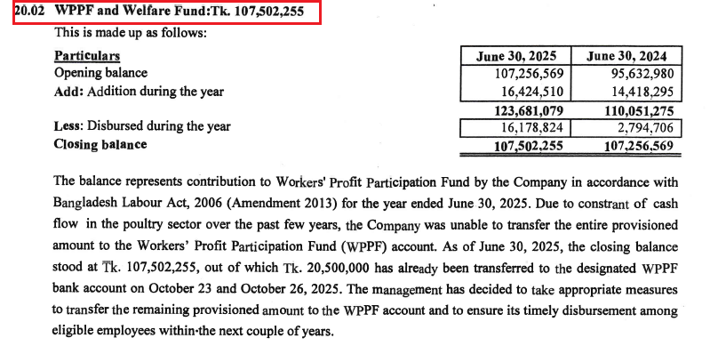 এ বিষয়ে জানতে কোম্পানি সচিব আবু জাফর আলি এফসিএস এবং প্রধান অর্থ কর্মকর্তা (ভারপ্রাপ্ত) ইকবাল আহমেদ এফসিএমএ- এর সঙ্গে যোগাযোগ করা হলে তারা কোম্পানির পক্ষ হতে লিখিত জবাব দেন। লিখিত জবাবে বলা হয়েছে, ‘বিগত কয়েক বছর ধরে পোল্ট্রি খাতে নগদ অর্থের সংকটের কারণে কোম্পানি WPPF এর সম্পূর্ন বকেয়া অর্থ পরিশোধ করতে সক্ষম হয়নি। তবে আমরা আইনের প্রতি শ্রদ্ধাশীল এবং আইন অনুযায়ী WPPF ফান্ডের হিসাব যথাযথভাবে সংরক্ষণ করা হয়েছে। ৩০ জুন ২০২৫ তারিখে মোট বকেয়া ছিল ১০,৭৫,০২,২৫৫/- টাকা, যার মধ্যে ২,০৫,০০,০০০/- গত ২৩/১০/২০২৫ এবং ২৬/১০/২০২৫ তারিখে WPPF একাউন্টে স্থানান্তর করা হয়েছে। কোম্পানির ব্যবস্থাপনা কর্তৃপক্ষ ইতিমধ্যে সিদ্ধান্ত নিয়েছে যে বাকী টাকা আগামী ২-৩ বছরের মধ্যে কর্মীদের মাঝে পর্যায়ক্রমে বিতরণ করা হবে। বিষয়টি আর্থিক বিবরণীর নোট ২০.০২ বিস্তারিত ব্যাখ্যা করা হয়েছে।’