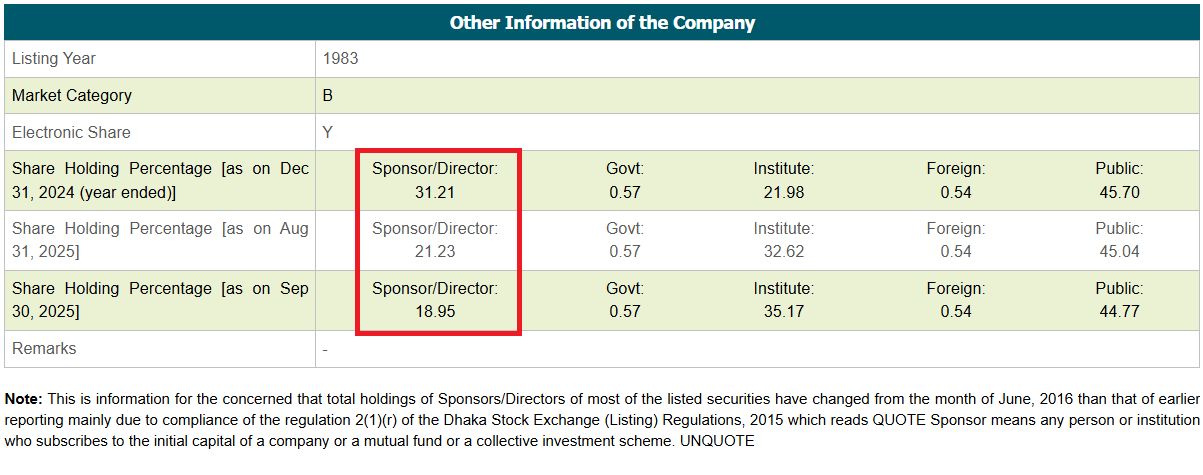 অথচ আইন স্পষ্টভাবে বলা আছে, তালিকাভুক্ত যে কোনো কোম্পানির উদ্যোক্তা ও পরিচালকদের সম্মিলিতভাবে অন্তত ৩০ শতাংশ শেয়ার থাকতে হবে। কিন্তু অবাক করা বিষয় হলো- যে কোম্পানির উদ্যোক্তা ও পরিচালকদের হাতে আইন অনুযায়ী নির্ধারিত পরিমাণ শেয়ার নেই, সেই কোম্পানিটি আরও শেয়ার বিক্রি করে সেপ্টেম্বর শেষে তা ১৮ শতাংশের (১৮.৯৫ শতাংশ) ঘরে নামিয়ে এনেছে। তারচেয়ে আজব বিষয় হলো- আইন লঙ্ঘণের সীমা পার করেও সেই শেয়ার বিক্রি বা হস্তান্তরের ক্ষেত্রে স্টক এক্সচেঞ্জ ছিলো নিশ্চুপ দর্শক।