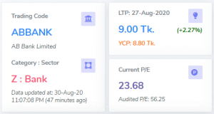 চিত্র-১: সমাপ্ত কার্যদিবসে কোম্পানিটির শেয়ারে সর্বশেষ ৯ টাকায় লেনদেন হওয়ার কথা বলা হয়েছে। এদিন কোম্পানিটির শেয়ারদর ২.২৭ শতাংশ বেড়েছে। আগের কার্যদিবসে কোম্পানিটির শেয়ারের ক্লোজ প্রাইস ছিল ৮.৮০ টাকা।‘জেড’ ক্যাটাগরির এ কোম্পানিটির বর্তমান পিই রেশিও ২৩.৬৮ এবং অডিটেড পিই ৫৬.২৫।