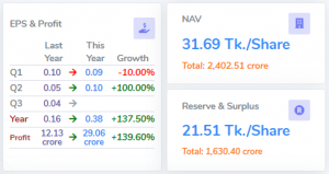 কোম্পানিটি সদ্য সমাপ্ত বছরে ২৯ কোটি ৬ লাখ টাকার মুনাফা করেছে, এর আগের বছরে যার পরিমাণ ছিল ১২ কোটি ১৩ লাখ টাকা। অর্থ্যাৎ এক বছরের ব্যবধানে কোম্পানিটি মুনাফা বেড়েছে ১৩৯.৬০ শতাংশ।