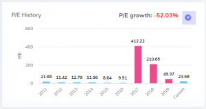 চিত্র-৫: গত ১০ বছরে কোম্পানিটির পিই রেশিও বিশ্লেষনে দেখা গেছে, কোম্পানিটির পিই গ্রোথ ৫২.০৩ শতাংশ কমেছে। ২০১১ থেকে ২০২০ সাল পর্যন্ত কোম্পানিটির পিই ছিল যথাক্রমে- ২১.৬৮, ১১.৪২, ১২.৭৮, ১১.৯৬, ৮.৬৪, ৯.৯১, ৪১২.২২, ২১০.৬৫, ৪৯.৩৭ এবং ২৩.৬৮।