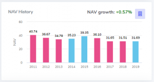 চিত্র-৭: গত ১০ বছরে কোম্পানিটির এনএভি বিশ্লেষনে দেখা গেছে, কোম্পানিটির এনএভি গ্রোথ ০.৫৭ শতাংশ বেড়েছে। ২০১১ থেকে ২০২০ সাল পর্যন্ত কোম্পানিটির এনএভি ছিল যথাক্রমে- ৪০.৭৪, ৩৬.৬৭, ৩৪.৭৮, ৩৫.২৩, ৩৯.৩৫, ৩৬.১০, ৩১.৬৫, ৩১.৫১ এবং ৩১.৬৯ টাকা।