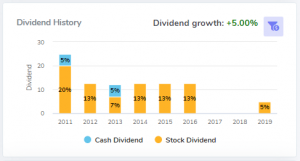 চিত্র-৯: গত ১০ বছরে কোম্পানিটির ডিভিডেন্ড গ্রোথ বিশ্লেষনে দেখা গেছে, কোম্পানিটির ডিভিডেন্ড গ্রোথ ৫ শতাংশ বেড়েছে। ২০১১ থেকে ২০২০ সাল পর্যন্ত কোম্পানিটির ডিভিডেন্ডের পরিমাণ ছিল যথাক্রমে- ২০%বি+৫%সি, ১৩%বি, ৭%বি+৫%সি, ১৩%বি, ১৩%বি, ১৩%বি, ১২.৫০%বি, ৫%বি এবং ৫%বি। এখানে ‘বি’ বলতে স্টক ডিভিডেন্ড এবং ‘সি’ বলতে ক্যাশ ডিভিডেন্ডকে বোঝানো হয়েছে।