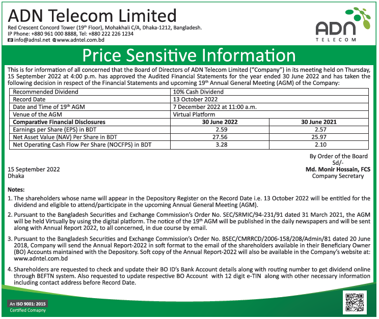 ডিভিডেন্ড ঘোষণা করেছে এডিএন টেলিকম