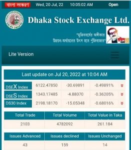 বাজার বিশ্লেষণে দেখা যায়, আজ ডিএসই প্রধান বা ডিএসইএক্স সূচক ৩০ পয়েন্ট কমে অবস্থান করছে ৬ হাজার ১২২ পয়েন্টে। অন্য সূচকগুলোর মধ্যে ডিএসইএস বা শরীয়াহ সূচক ৪ পয়েন্ট কমে অবস্থান করছে ১ হাজার ৩৪৩ পয়েন্টে। ডিএস৩০ সূচক ১৫ পয়েন্ট কমে অবস্থান করছে ২ হাজার ১৯৮ পয়েন্টে।