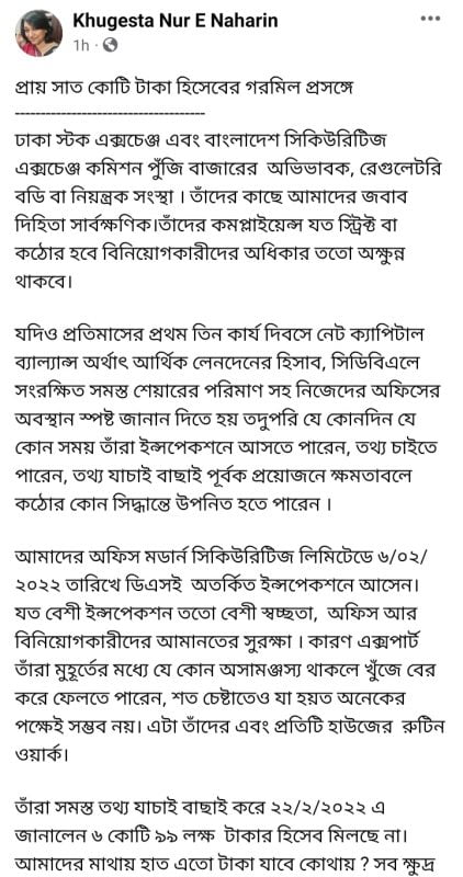 ‘আমাদের অফিস মডার্ন সিকিউরিটিজ লিমিটেডে ৬/০২/ ২০২২ তারিখে ডিএসই অতর্কিত ইন্সপেকশনে আসেন। যত বেশী ইন্সপেকশন ততো বেশী স্বচ্ছতা, অফিস আর বিনিয়োগকারীদের আমানতের সুরক্ষা । কারণ এক্সপার্ট তাঁরা মুহূর্তের মধ্যে যে কোন অসামঞ্জস্য থাকলে খুঁজে বের করে ফেলতে পারেন, শত চেষ্টাতেও যা হয়ত অনেকের পক্ষেই সম্ভব নয়। এটা তাঁদের এবং প্রতিটি হাউজের রুটিন ওয়ার্ক।’