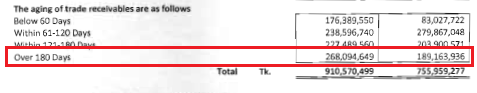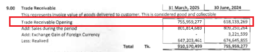 কোম্পানির প্রতিবেদন বিশ্লেষনে দেখা যাচ্ছে, ট্রেড রিসিভেবলস বা পাওনা টাকার অংক অস্বাভাবিকভাবে বেড়ে গেছে। গত বছরের জুনে এ খাতে কোম্পানির পাওনা ছিল ৭৫ কোটি ৫৯ লাখ ৫৯ হাজার ২৭৭ টাকা, অথচ চলতি বছরের মার্চ শেষে তা দাঁড়িয়েছে ৯১ কোটি ৫ লাখ ৭০ হাজার ৪৯৯ টাকায়। মাত্র নয় মাসে ১৫ কোটির বেশি বৃদ্ধি বিনিয়োগকারীদের কপালে চিন্তার ভাঁজ ফেলেছে। এর মধ্যে ২৬ কোটি ৮০ লাখ টাকা এমন পাওনা, যা ছয় মাসেরও বেশি সময় ধরে আদায় হয়নি।