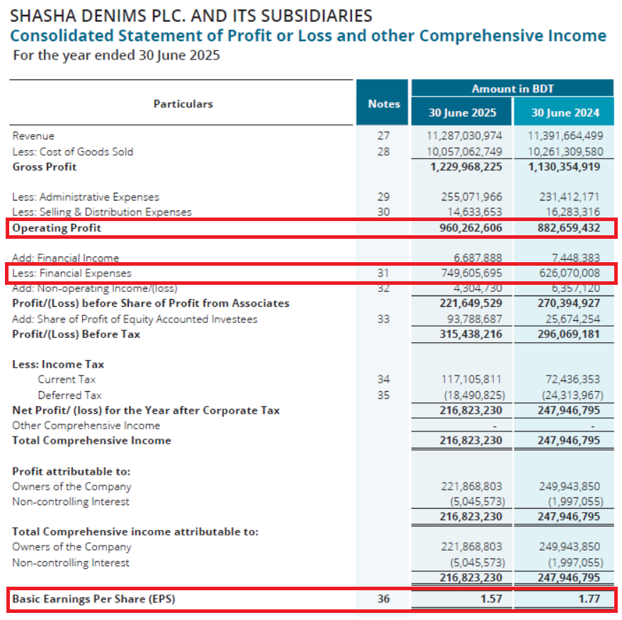 শাশা ডেনিমস পিএলসি, বাংলাদেশের শেয়ারবাজারে তালিকাভুক্ত একটি ডেনিম প্রস্তুতকারক কোম্পানি, বর্তমানে এমনই একটি সংকটের মধ্যে পড়েছে। গত বছরের (২০২৪ সাল) তুলনায় ২০২৫ সালে শাশা ডেনিমসের মুনাফা ও শেয়ারপ্রতি আয় (ইপিএস) গুরুতরভাবে কমে গেছে এবং এর প্রধান কারণ হচ্ছে তাদের ঋণের সুদের পরিমাণ। অপারেটিং প্রফিটের ৭৮ শতাংশ শুধুমাত্র সুদের খরচে চলে যাওয়ার ফলে, কোম্পানির মুনাফা বড় অংশ হারিয়ে যাচ্ছে, যা শেয়ারবাজার এবং বিনিয়োগকারীদের জন্য গুরুতর ঝুঁকি সৃষ্টি করছে।