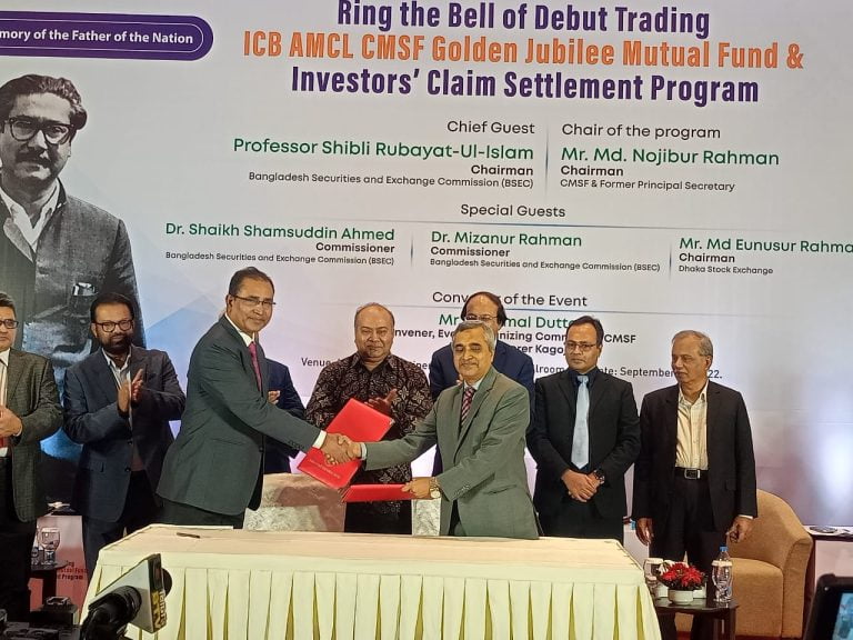 মঙ্গলবার (২০ সেপ্টেম্বর) রাজধানীর ইন্টারকন্টিনেন্টাল হোটেলে আইসিবি এএমসিএল সিএমএসএফ গোল্ডেন জুবিলি মিউচ্যুয়াল ফান্ডের উদ্বোধনী অনুষ্ঠানে বাংলাদেশ সিকিউরিটিজ অ্যান্ড এক্সচেঞ্জ কমিশনের (বিএসইসি) চেয়ারম্যান প্রফেসর শিবলী রুবাইয়াত-উল ইসলাম এসব কথা বলেন।
