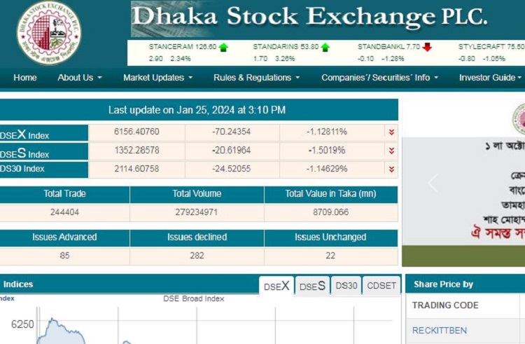 ফ্লোর প্রাইজ প্রতাহারের পর দুই দিন সূচক বাড়লেও বাকি তিন কার্যদিবসে দেশের প্রধান পুঁজিবাজার ঢাকা স্টক এক্সচেঞ্জের (ডিএসই) প্রধান বা ডিএসইএক্স সূচক কমেছে ১৮০ পয়েন্ট। আজ বৃহস্পতিবার (২৫ জানুয়ারি) ডিএসইর সকল সূচকের ব্যাপক পতনে লেনদেন কমেছে তিন’শ কোটি টাকার বেশি। এদিনও ডিএসইর দরপতনে ২৮২টির বা ৭২ শতাংশ কোম্পানির শেয়ারদর। এদিন অপর বাজার চট্টগ্রাম স্টক এক্সচেঞ্জে (সিএসই) প্রধান মূল্য সূচক ২৫৯ পয়েন্ট কমে লেনদেন শেষ হয়েছে। ডিএসই ও সিএসই সূত্রে এ তথ্য জানা গেছে।