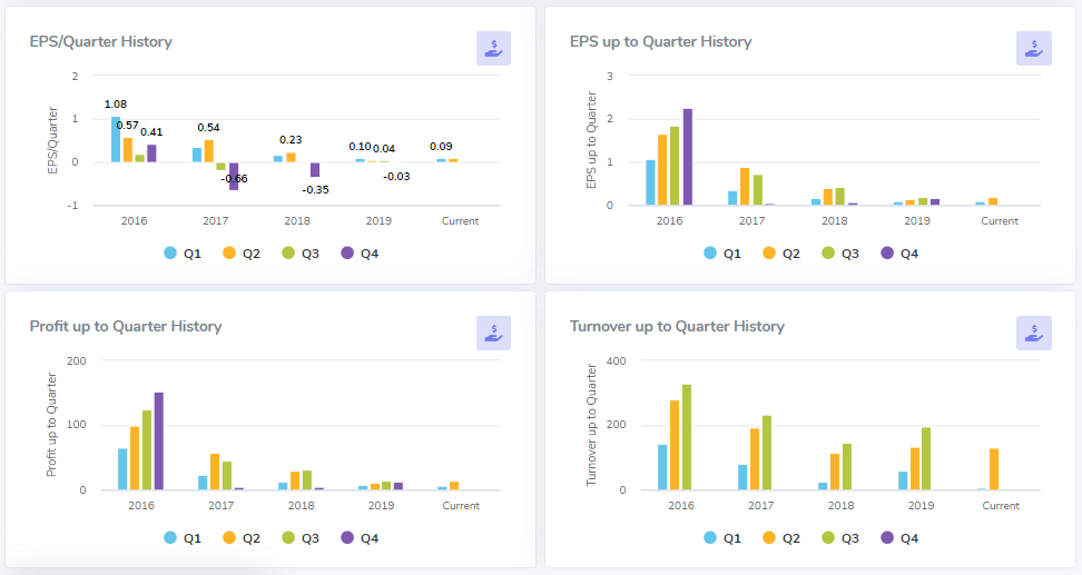 চিত্র-২: কোম্পানিটির মুনাফার তথ্য বিশ্লেষনে দেখা গেছে, সদ্য সমাপ্ত বছরের প্রথম প্রান্তিকে কোম্পানিটির শেয়ারপ্রতি আয় (ইপিএস) ০.০৯ টাকা হয়েছে। গতবছরের একই সময়ে যা ছিল ০.১০ টাকা।সে হিসেবে শতাংশের ভিত্তিতে যা ১০ শতাংশ কমেছে। এছাড়া দ্বিতীয় প্রান্তিকে ০.১০ টাকা যা আগের বছর ছিল ০.০৫ টাকা, তৃতীয় প্রান্তিকে ০.১৯ টাকা যা আগের বছর ছিল ০.০৫ টাকা এবং বছর শেষে ইপিএস দাঁড়িয়েছে ০.১৬ টাকায় যা আগের বছর ছিল ০.১৬ টাকা।