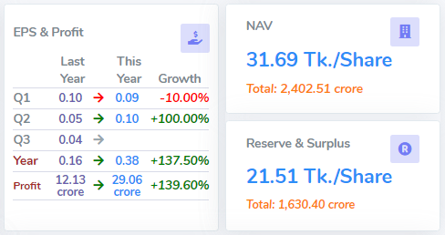 কোম্পানিটির মোট ২,৪০২ কোটি ৫১ লাখ টাকার সম্পদ রয়েছে। সে হিসেবে কোম্পানিটির শেয়ারপ্রতি সম্পদ মূল্য ৩১.৬৯ টাকা।এছাড়া কোম্পানির মোট রিজার্ভের পরিমাণ ১,৬৩০ কোটি ৪০ লাখ টাকা। সে হিসেবে প্রতি শেয়ারের বিপরীতে কোম্পানিটির ২১.৫১ টাকা রিজার্ভ রয়েছে।