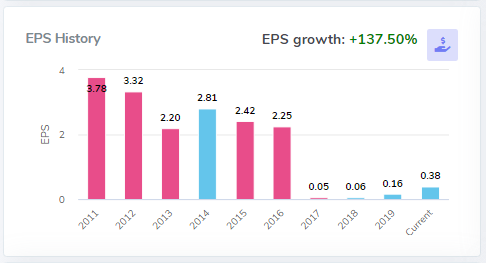 চিত্র-৬: গত ১০ বছরে কোম্পানিটির ইপিএস বিশ্লেষনে দেখা গেছে, কোম্পানিটির ইপিএস গ্রোথ ১৩৭.৫০ শতাংশ বেড়েছে। ২০১১ থেকে ২০২০ সাল পর্যন্ত কোম্পানিটির ইপিএস ছিল যথাক্রমে- ৩.৭৮, ৩.৩২, ২.২০, ২.৮১, ২.৪২, ২.২৫, ০.০৫, ০.০৬ এবং ০.৩৮ টাকা।