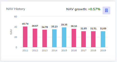 চিত্র-৭: গত ১০ বছরে কোম্পানিটির এনএভি বিশ্লেষনে দেখা গেছে, কোম্পানিটির এনএভি গ্রোথ ০.৫৭ শতাংশ বেড়েছে। ২০১১ থেকে ২০২০ সাল পর্যন্ত কোম্পানিটির এনএভি ছিল যথাক্রমে- ৪০.৭৪, ৩৬.৬৭, ৩৪.৭৮, ৩৫.২৩, ৩৯.৩৫, ৩৬.১০, ৩১.৬৫, ৩১.৫১ এবং ৩১.৬৯ টাকা।