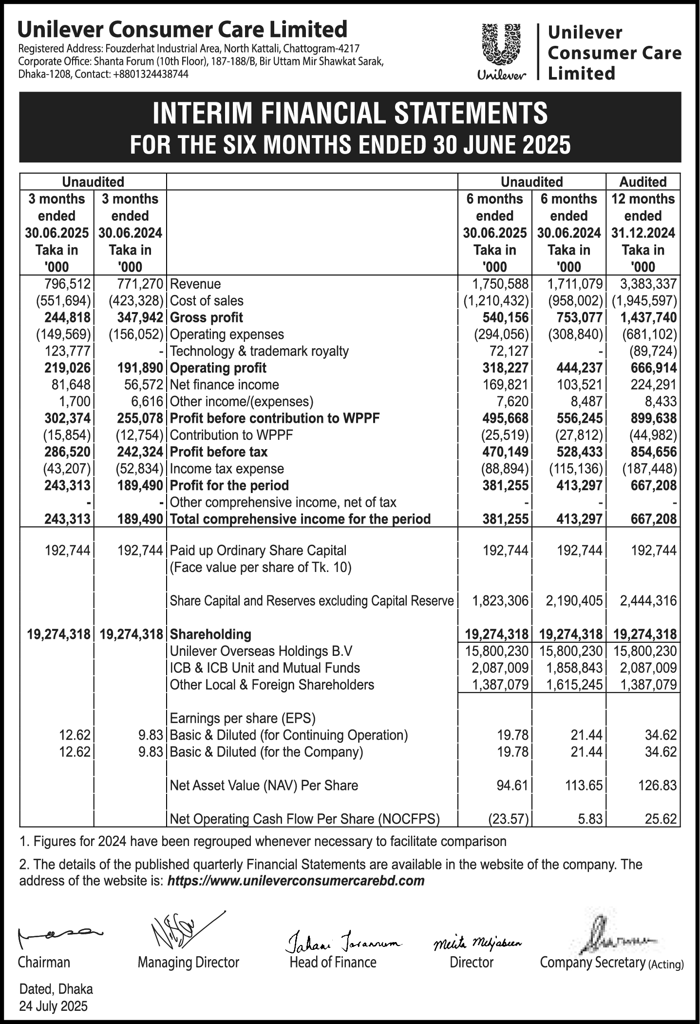 Financial Statement (Q-2) of Unilever Consumer Care Limited