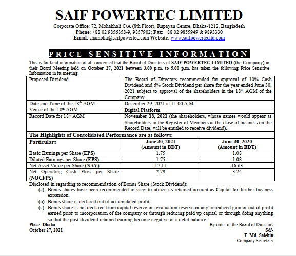 Price Sensitive Information of Saif Powertec Limited